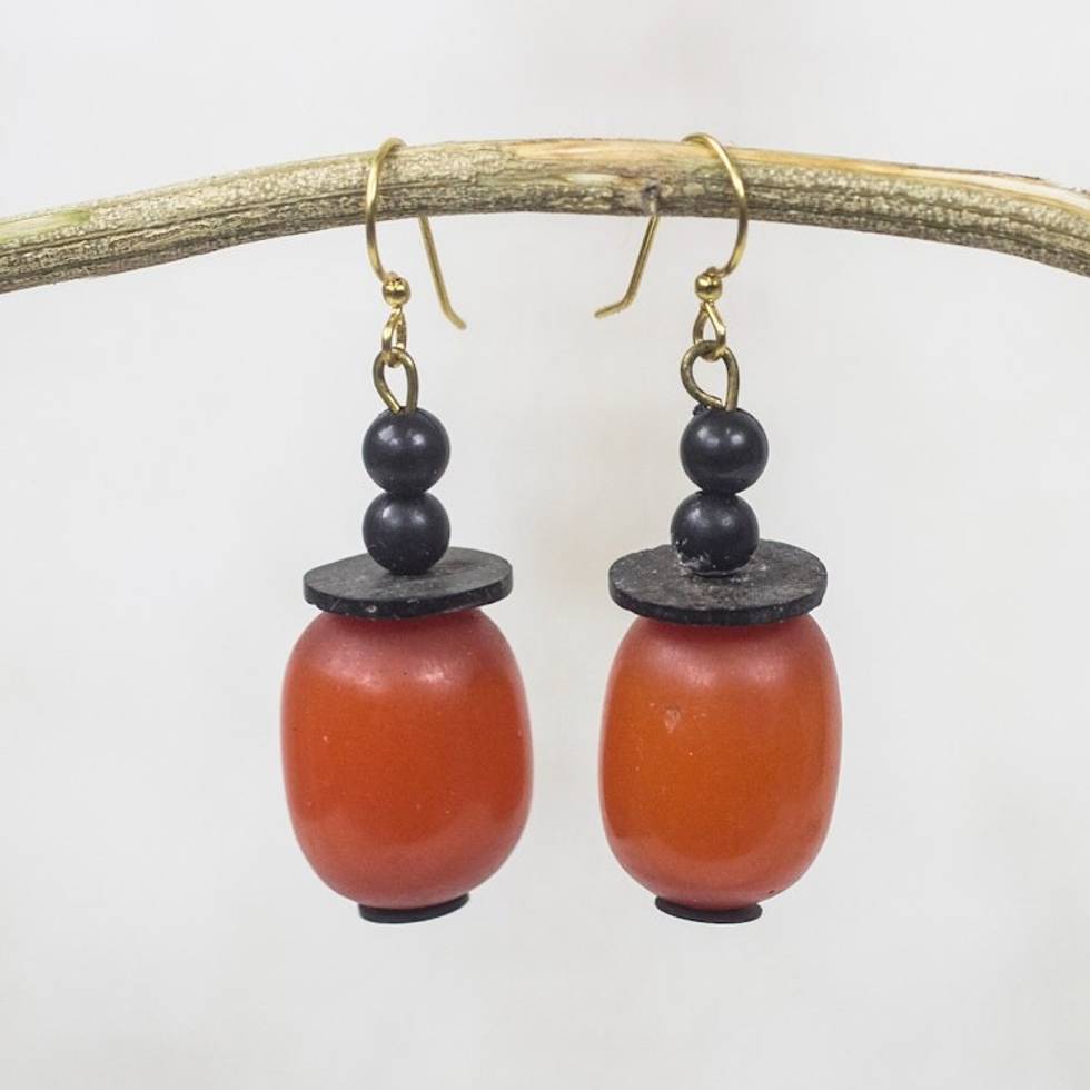 Orange Wood and Recycled Plastic Dangle Earrings 'Happy Helper' Item ID: 2671805616