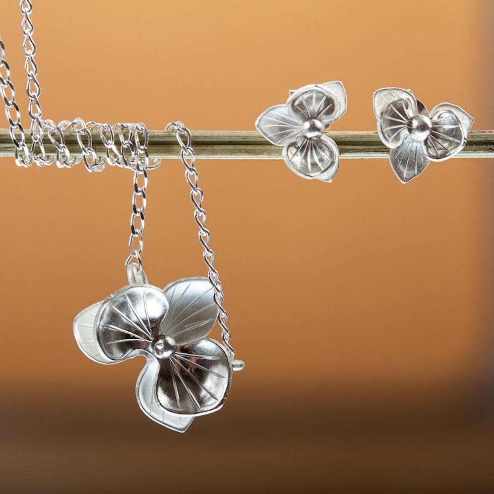 Orchid-Themed Polished Handcrafted Silver Jewelry Set 'Blooming Orchid' Item ID: 2669940060
