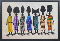 "Moving from place to place with their belongings in bundles, people seek pasture or water or a place to live in peace. Emmanuel Atiemoh Yeboah depicts them in silhouette in this handsome work of art. He works in oils on calico, adding cutouts of batik cloth for their gowns, and framing it with tweneboa wood."