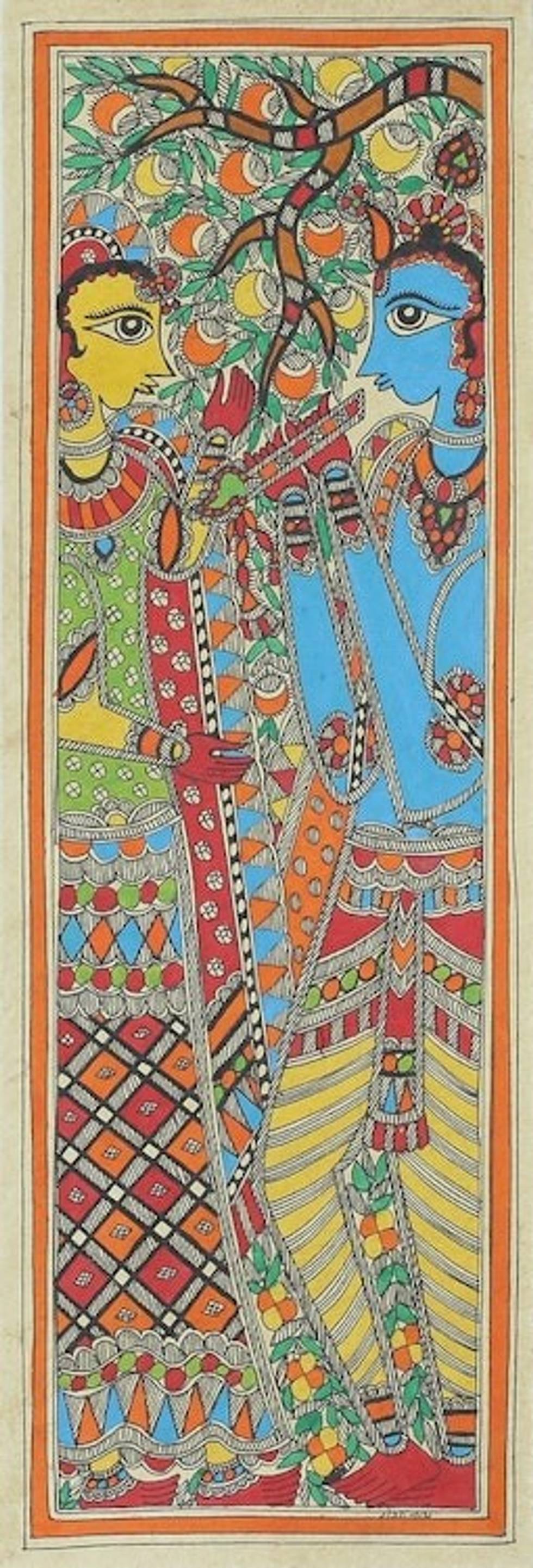 Original Freehand Madhubani Painting of Krishna and Radha 'Celestial Lovers' Item ID: 2671790132
