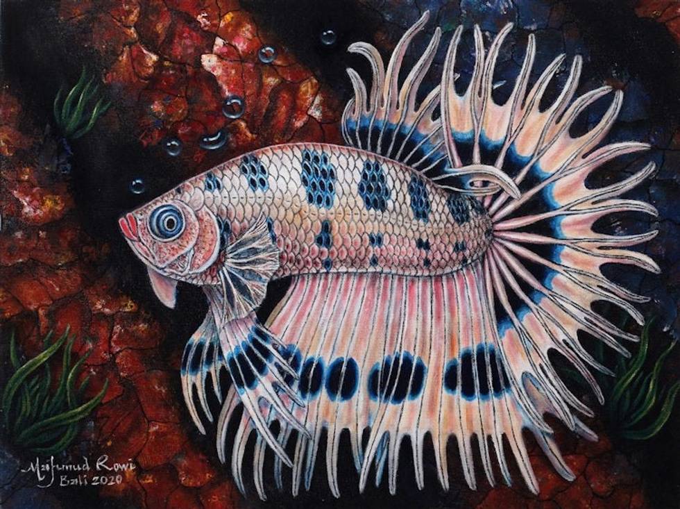 Original Signed Betta Fish Painting from Bali 'White and Black Betta' Item ID: 2669889346