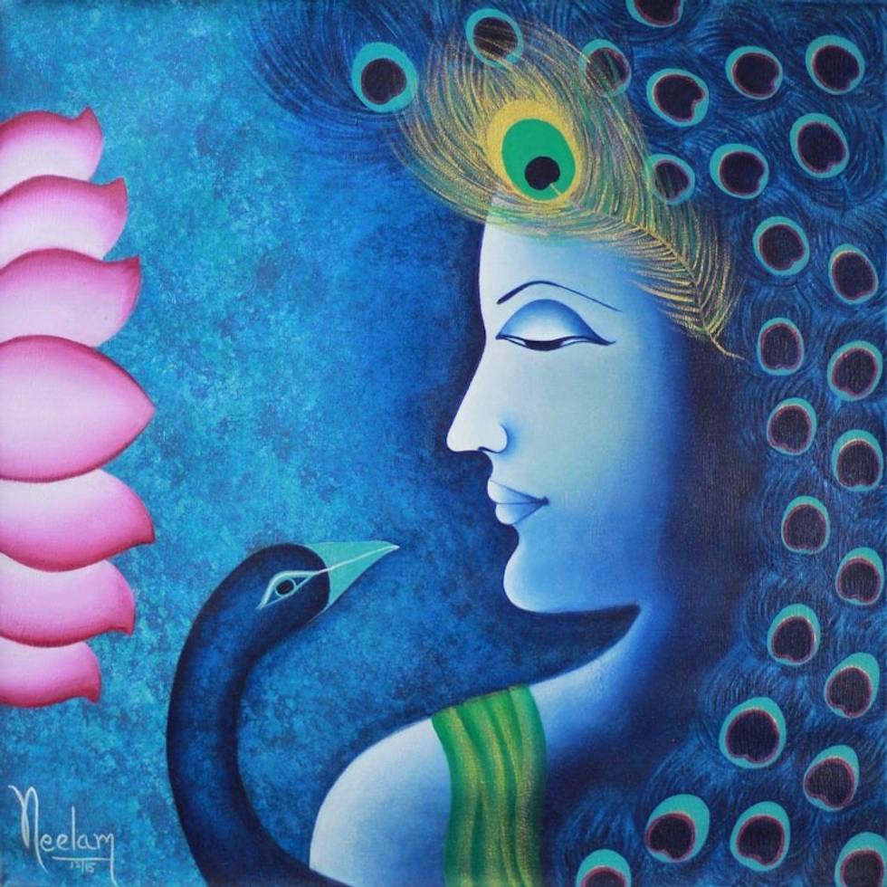 Original Signed Krishna and Peacock Painting in Blue 'Blue Majesty' Item ID: 2669890153