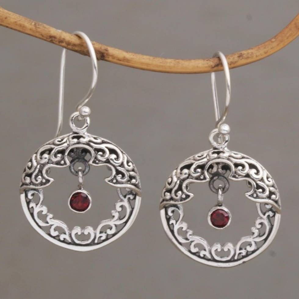 Ornate Balinese Earrings in Sterling Silver and Garnet 'Uluwatu Moon' Item ID: 2671734403