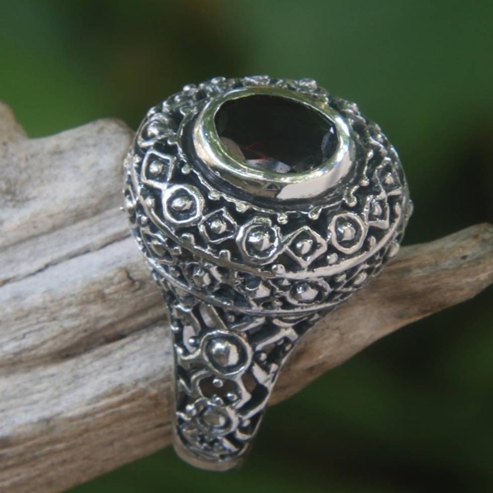Ornate Balinese Garnet and Sterling Silver Ring 'Ornate Jungle Wreath' Item ID: 2671701531