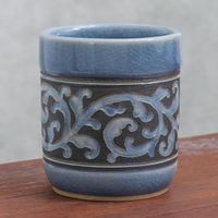 Ornate Blue Celadon Ceramic Teacup from Thailand 'Blue Kanok' Item ID: 2671799583