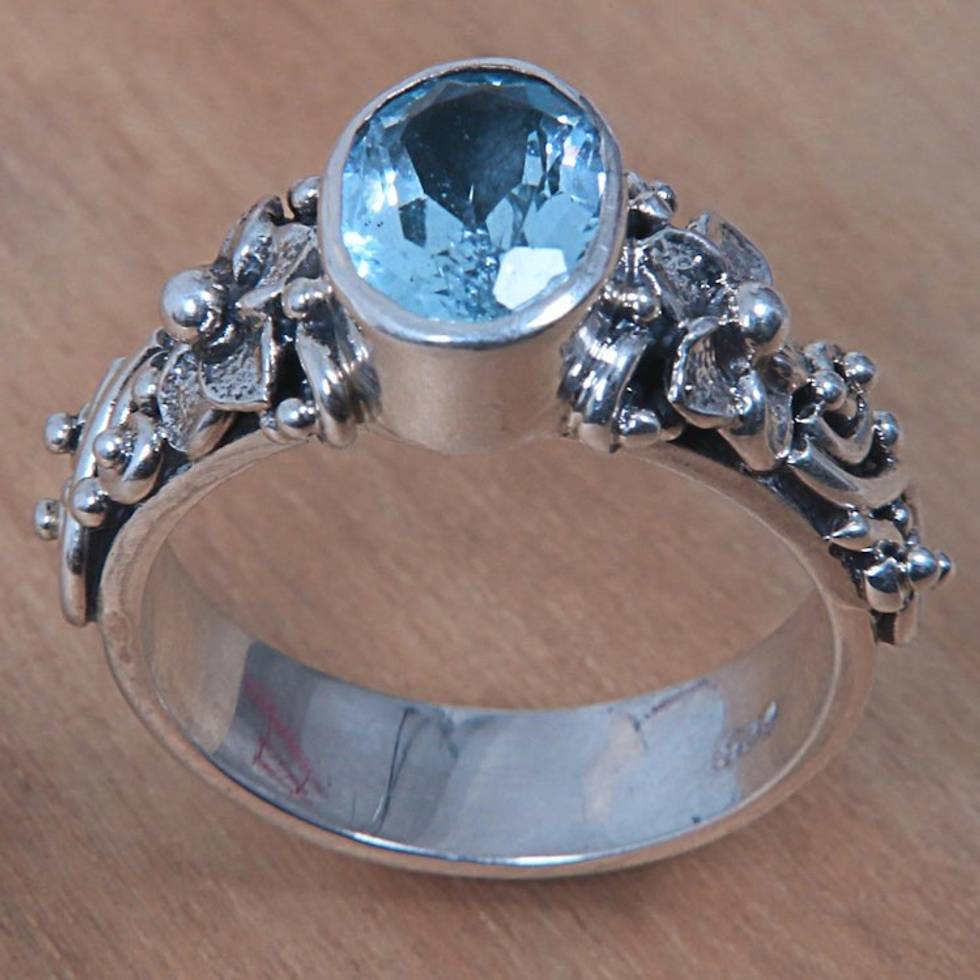 Oval Cut Blue Topaz and Silver Ring with Floral Design 'Frangipani Path' Item ID: 2669921253
