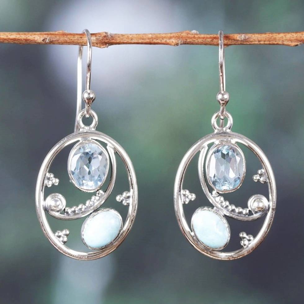 Oval Dangle Earrings with Blue Topaz and Larimar Gems 'Heaven's Mirror' Item ID: 2669924898