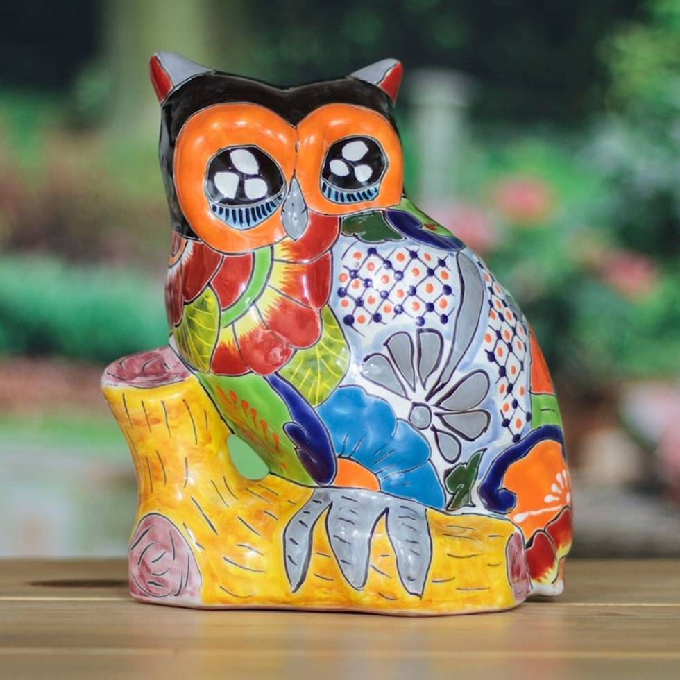 Owl-Themed Floral Painted Ceramic Sculpture from Mexico 'Sunshine Sage' Item ID: 2671807573