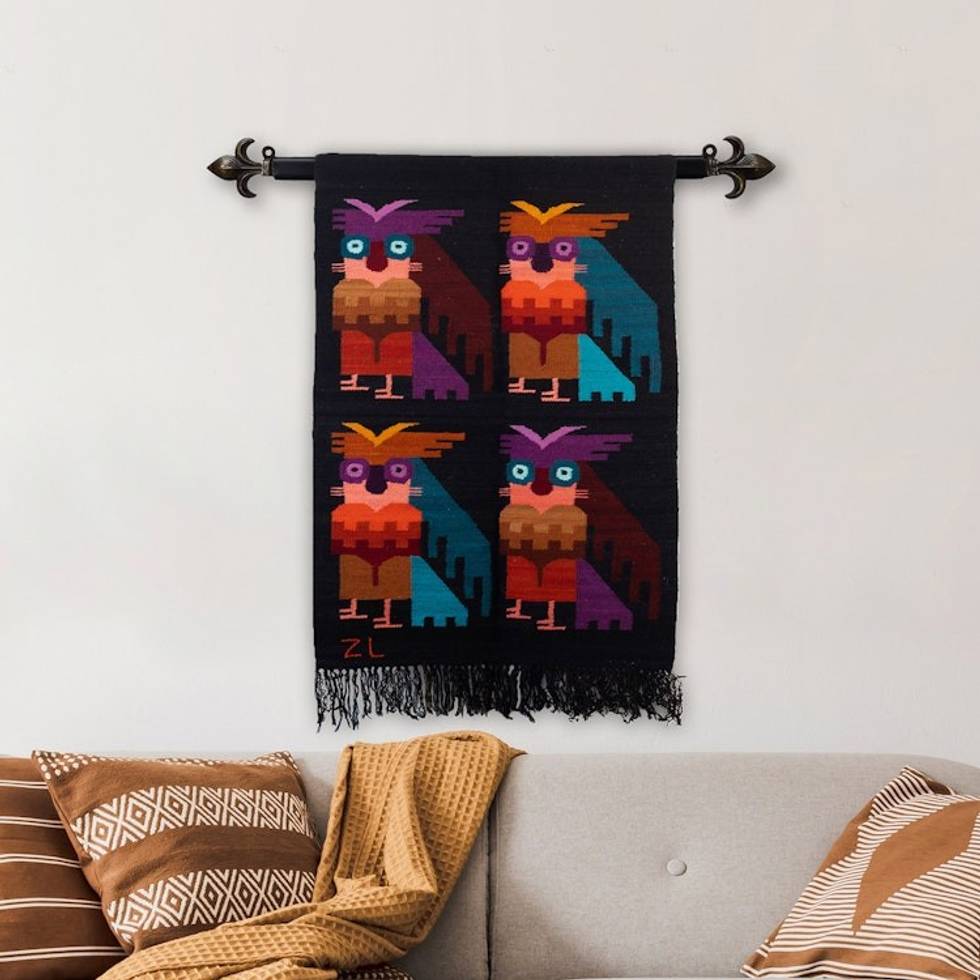 Owl-Themed Handloomed Black Wool and Cotton Blend Tapestry 'Owl Night' Item ID: 2671697892