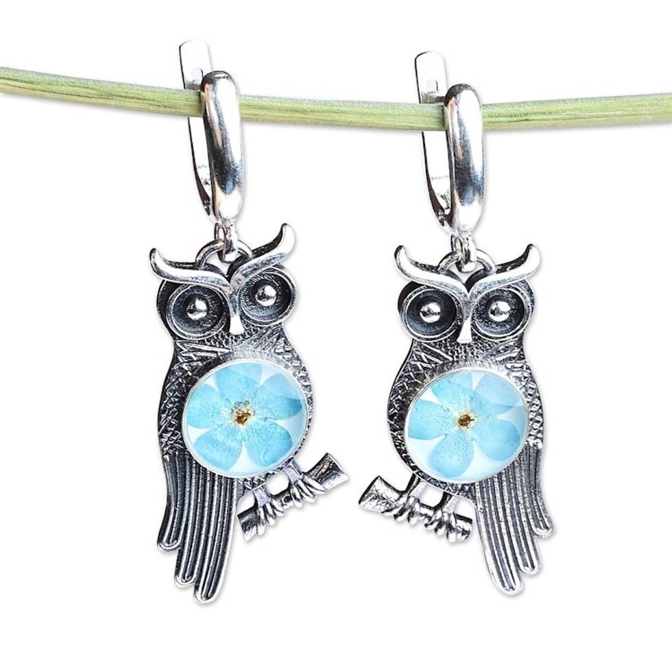 Owl-Themed Natural Flower Sterling Silver Dangle Earrings 'Sage's Memories' Item ID: 2669941002