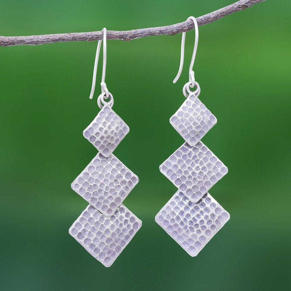 Oxidized Hand Tooled Sterling Silver Square Dangle Earrings 'Spark of Life in Grey' Item ID: 2671799665