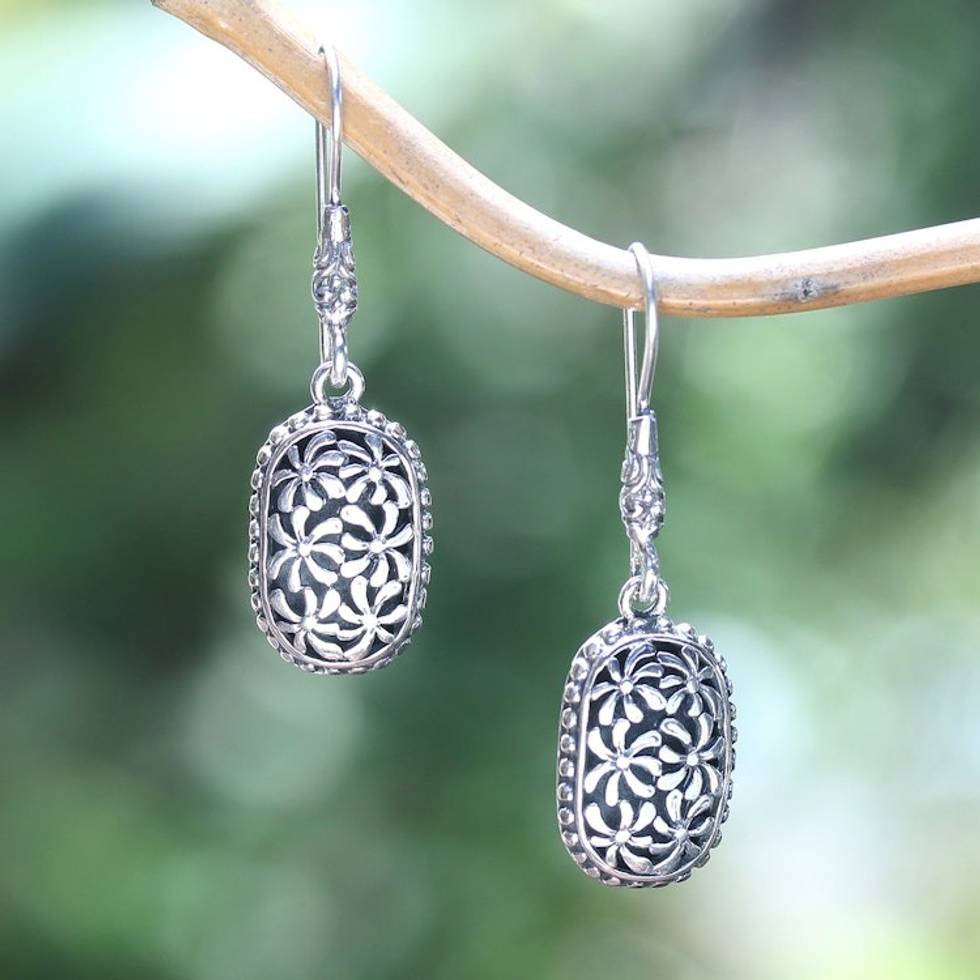 Oxidized Polished Sterling Silver Floral Dangle Earrings 'Fantasy Blooms' Item ID: 2671765398