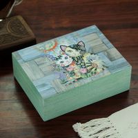 There are so many fun characters on this Day of the Dead design. Very colorful and detailed. Love the "treasure chest" shape. Looks great on my dresser.