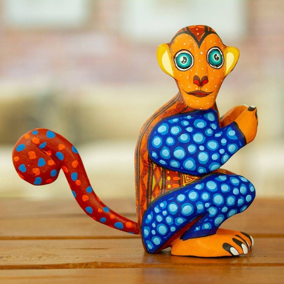 Painted Brown and Blue Copal Wood Alebrije Monkey Figurine 'Playful Soul in Brown' Item ID: 2671807829