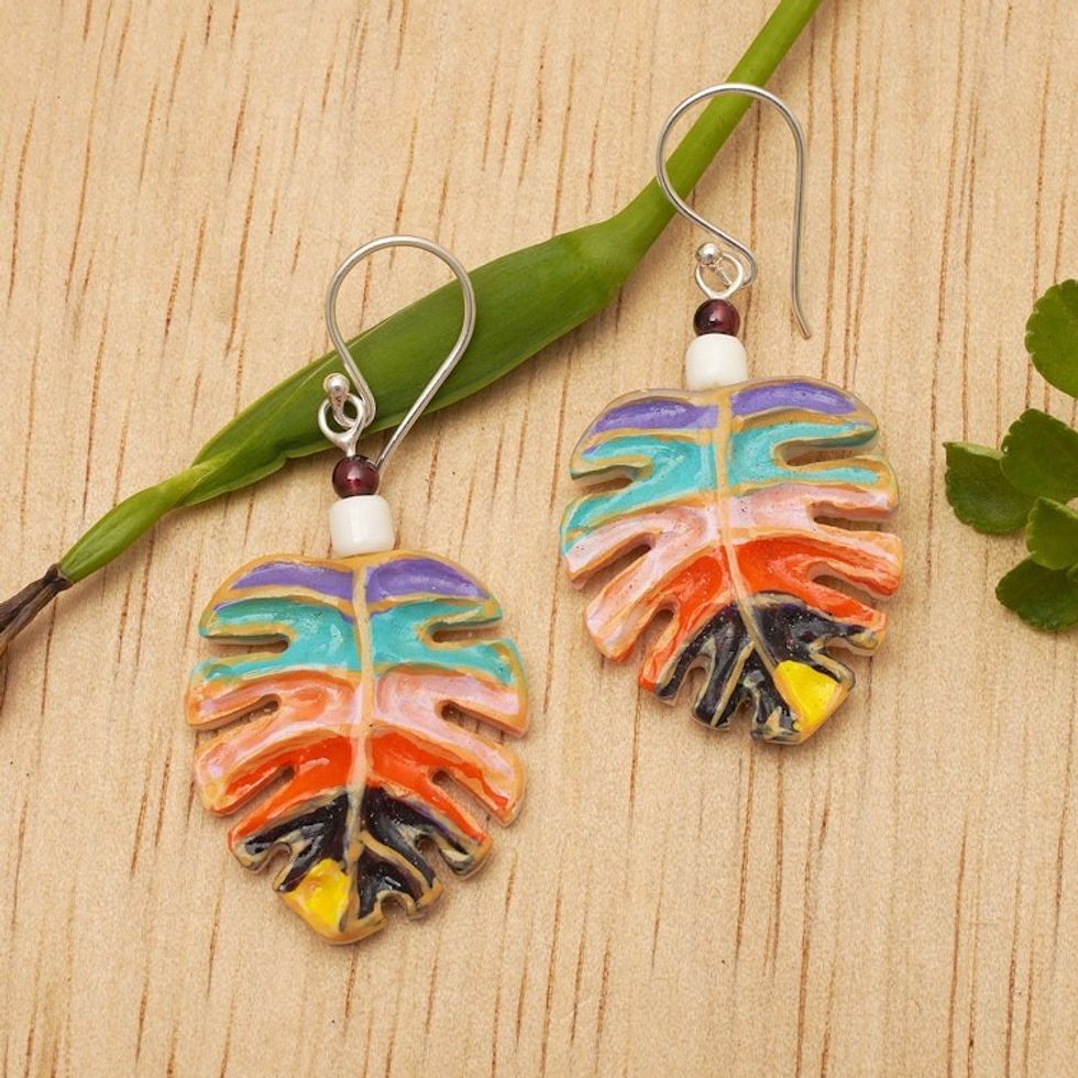 Painted Carved Monstera Leaf Garnet Silver Dangle Earrings 'Colorful Monstera' Item ID: 2671671648
