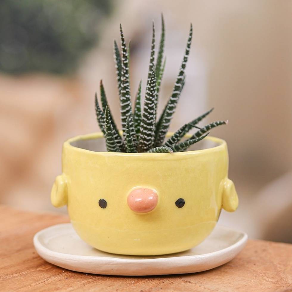 "Add a loving vibe to the season! Thailand's Paiboon designs this flower pot and saucer set, whose glazed finish enriches the hand-painted image of a tender chick. The set allows for drainage, and its sturdy structure makes it ideal for any ambiance."