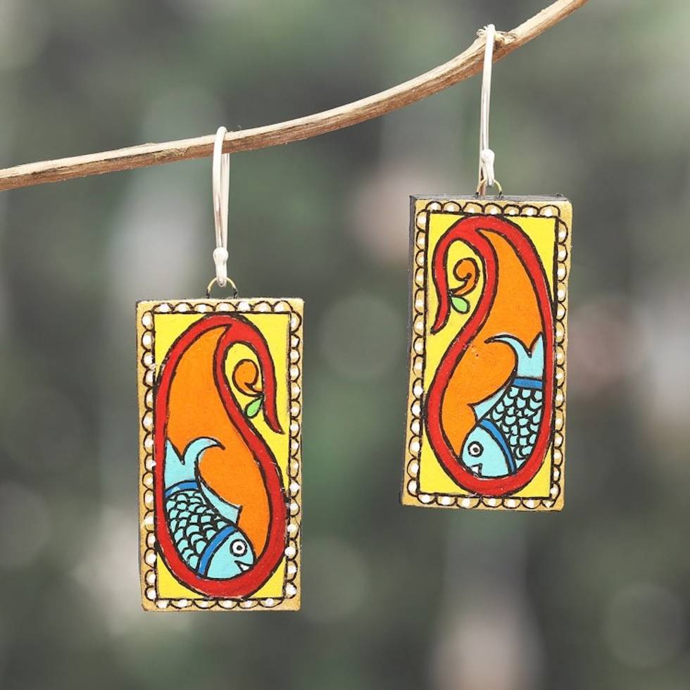 Painted Paisley Ceramic Dangle Earrings with Fish Motifs 'Paisley Fish' Item ID: 2669924828