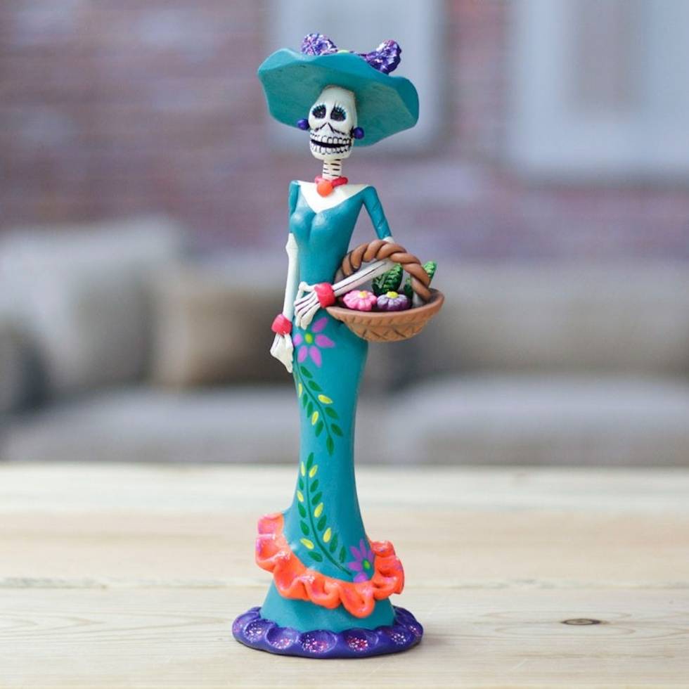 Painted Spring Lady Catrina Ceramic Sculpture in Teal 'Lady Catrina in Spring' Item ID: 2671807828