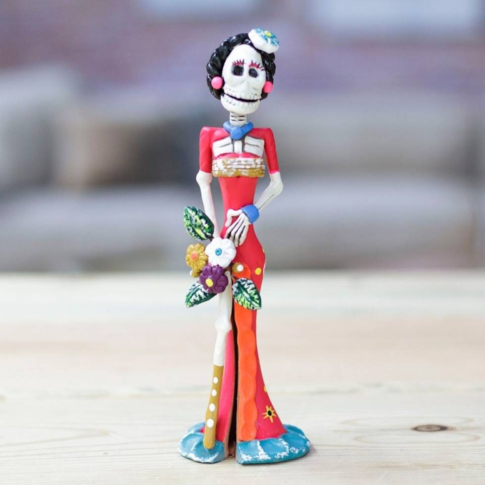 "The wise image of Frida Kahlo transforms into an elegant Catrina in this ceramic sculpture by Jorge Escamilla of Mexico. The artisan draws inspiration from the Day of the Dead celebrations and the region's iconic figures to create this unique artwork, whose hand-painted finish in warm colors and floral details evokes a spring essence."