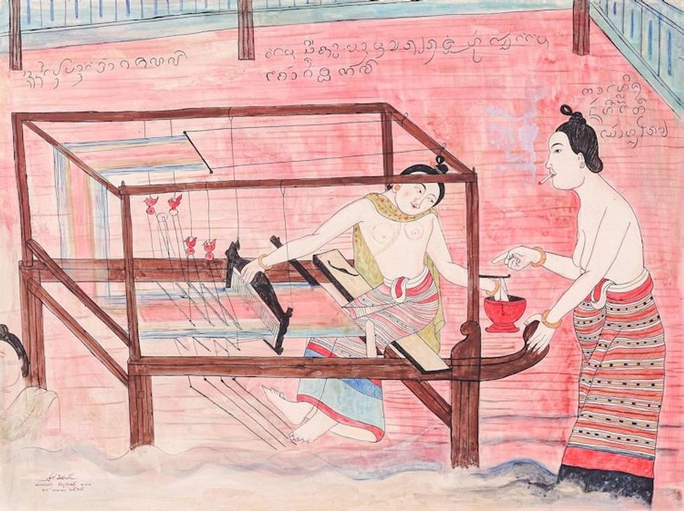 Painting of a Weaver and Teacher in Thai Temple Style 'The Weaving' Item ID: 2669889595