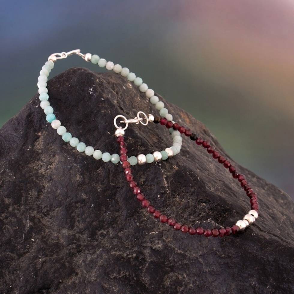 Pair of Amazonite Garnet Silver Beaded Wristband Bracelets 'Serene Elegance' Item ID: 2671698018