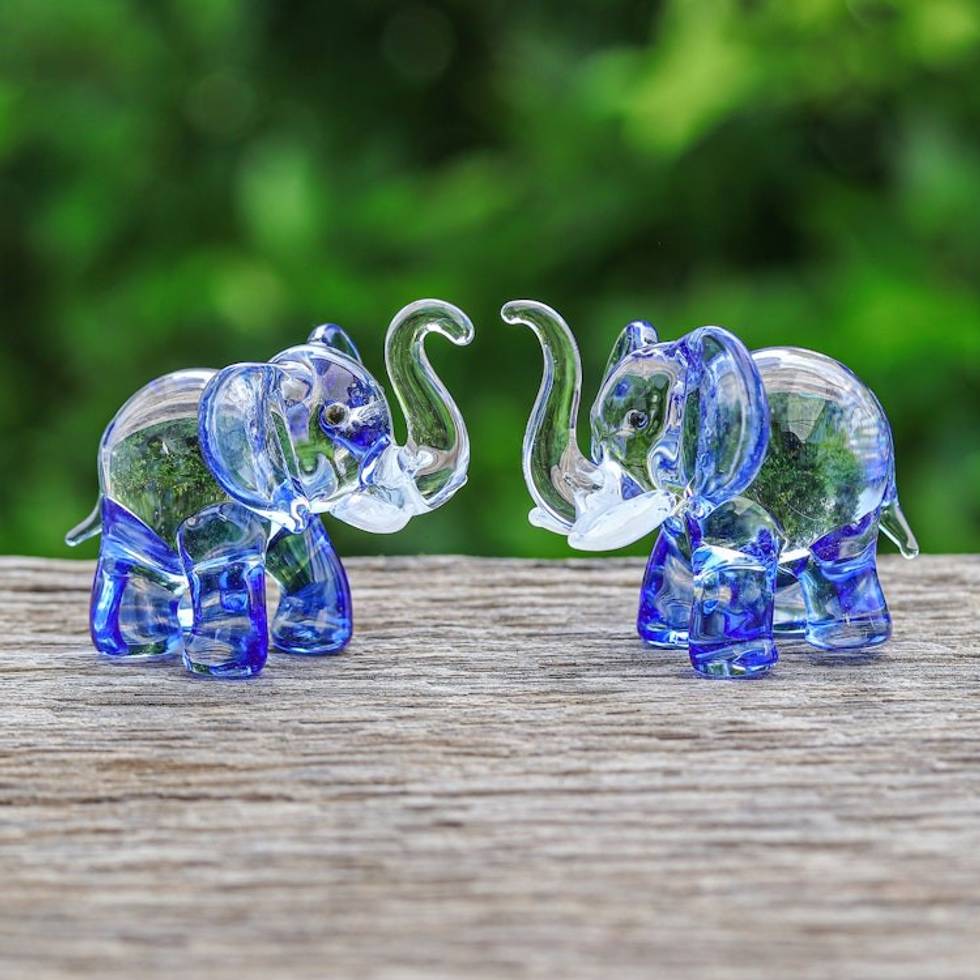 "Made with blue-toned glass as a symbol of magic, this lovely pair of elephants come to your home to attract positive energies and imagination. Thai artisan Panapai masterfully handcrafts each figurine using handblown techniques passed down from generation to generation, which allows these adorable giants to shine gracefully."