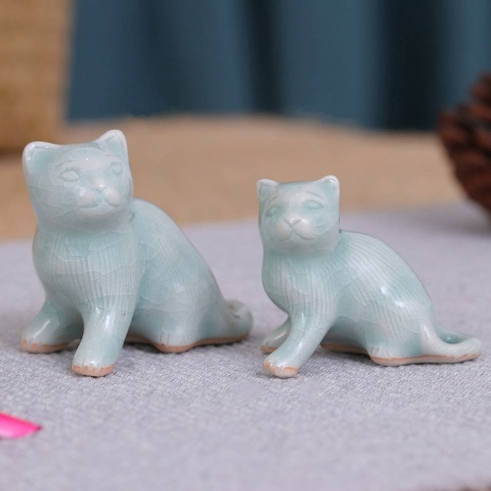 Pair of Celadon Ceramic Cat Figurines Handmade in Thailand 'Cat Allure' Item ID: 2671641313