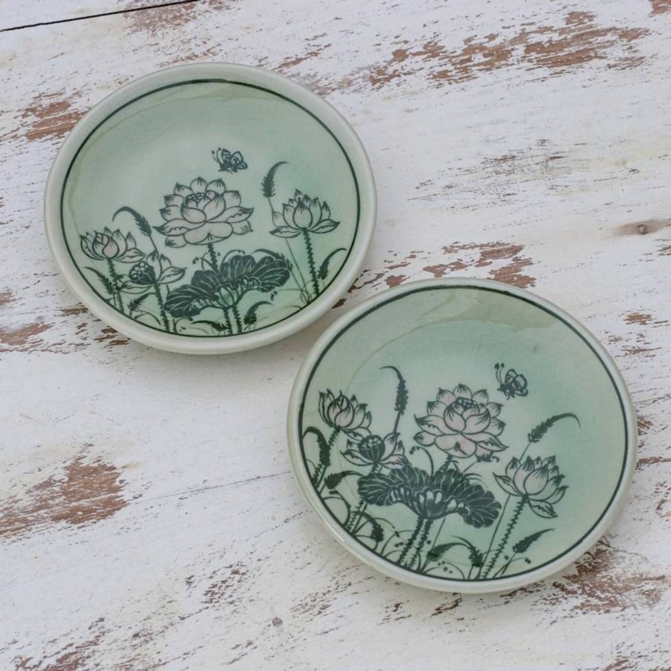 Pair of Celadon Ceramic Saucers Hand-Crafted in Thailand 'Luxuriant Lotus' Item ID: 2671798008