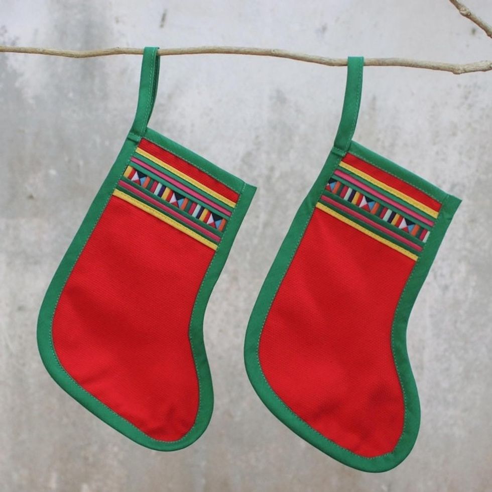 Pair of Cotton Blend Stockings Ornaments from Thailand 'Lisu Stockings in Red' Item ID: 2671801420