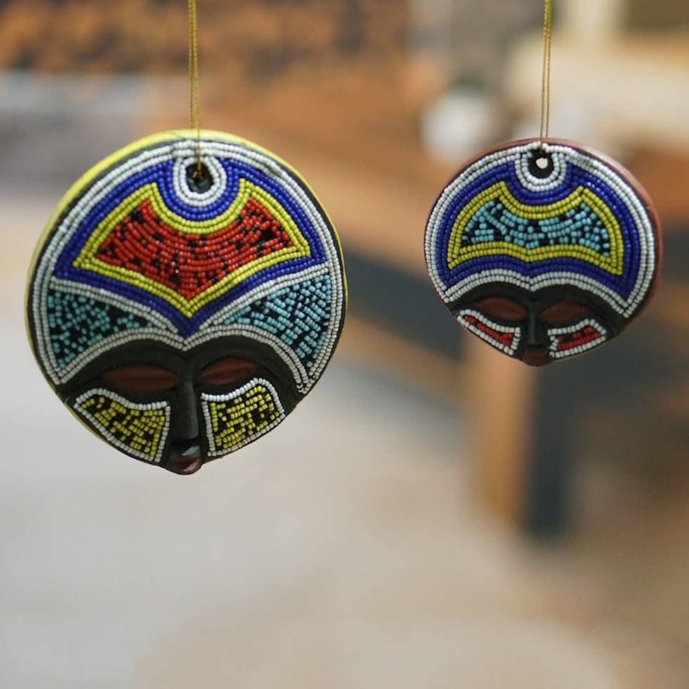 Pair of Eco-Friendly Recycled Plastic Beaded Wood Ornaments 'Ashanti Vibrancy' Item ID: 2671806564