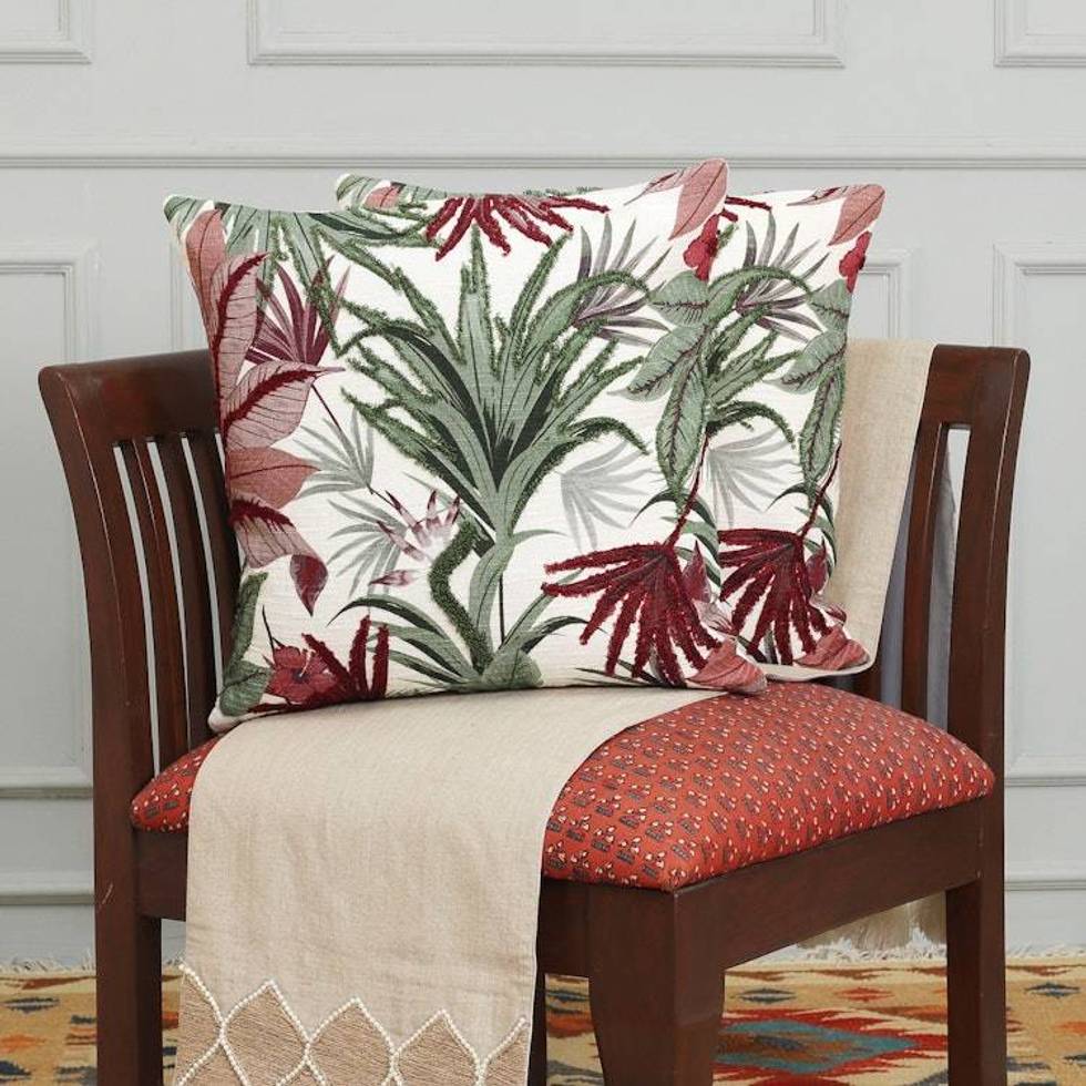 Pair of Embroidered Green and Red Cotton Cushion Covers 'Vermilion Nature' Item ID: 2676663771