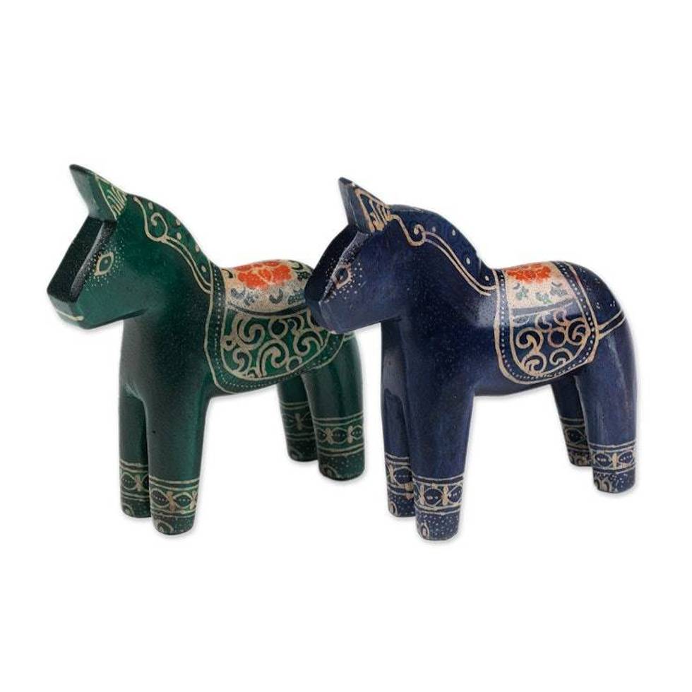 Pair of Hand-Painted Batik Dala Horse-Themed Wood Figurines 'Colorful Dala Horses' Item ID: 2676667679