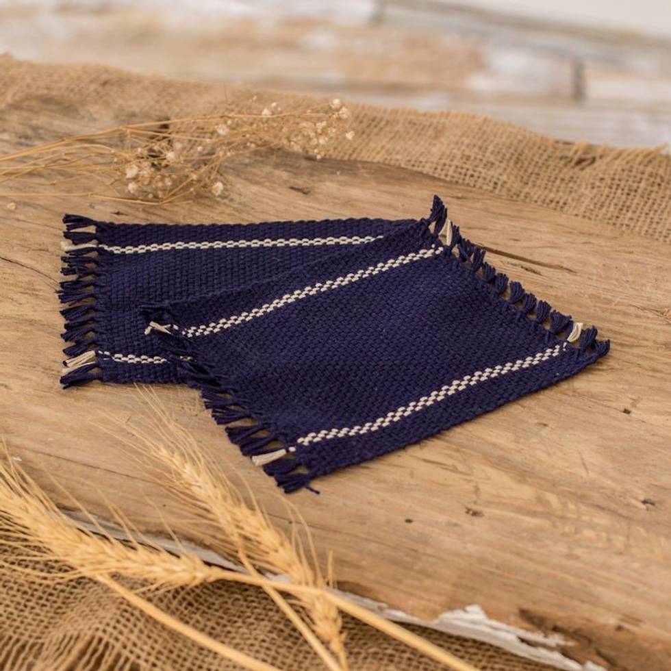 "Your beverage service will never be the same again with these alluring cotton coasters, skillfully hand-woven in El Salvador. Margarita Lainez's charming accessories boast delightful fringes and a sophisticated blue-and-white palette that promises to grace your table with an air of refined elegance while keeping your surfaces protected."
