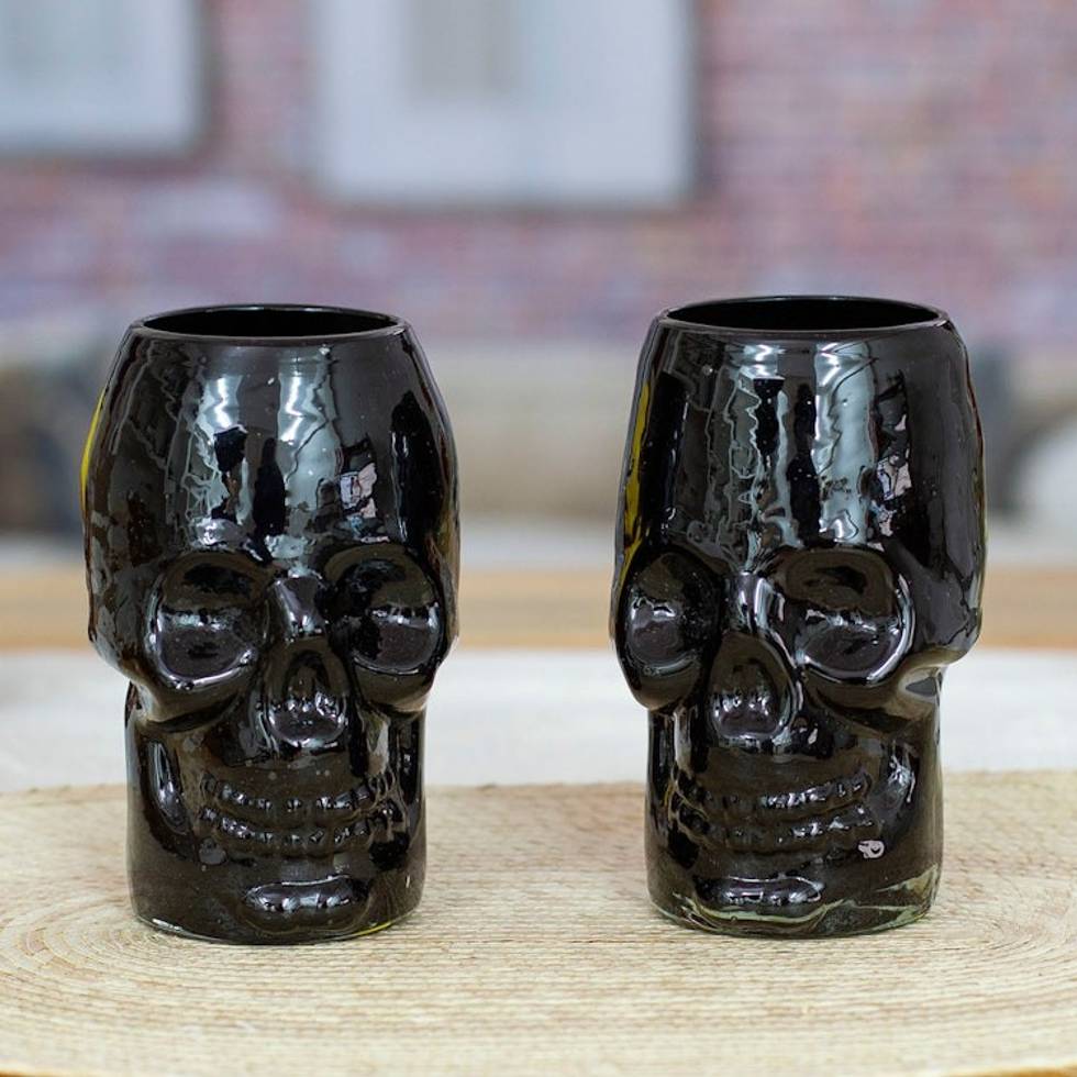 Pair of Handblown Recycled Glass Skull Tumblers in Black Hue 'Black Mexican Skull' Item ID: 2671638991