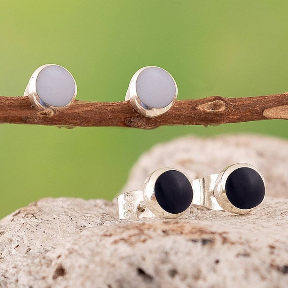 Pair of High-Polished White and Black Onyx Button Earrings 'Shadow Specks' Item ID: 2671697765