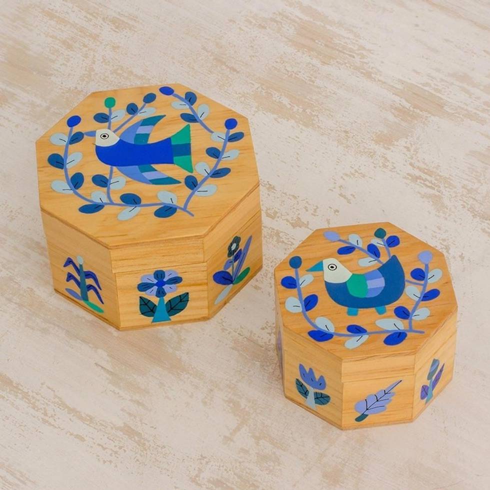 Pair of Pinewood Decorative Boxes with Bird Motifs in Blue 'God's Nature in Blue' Item ID: 2671777806