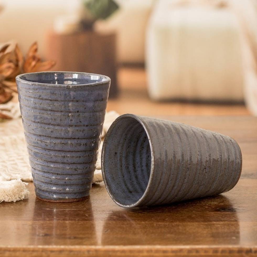 Pair of Shabby Chic Ceramic Cups in Blue and Brown 'Bluish Depth' Item ID: 2671768811