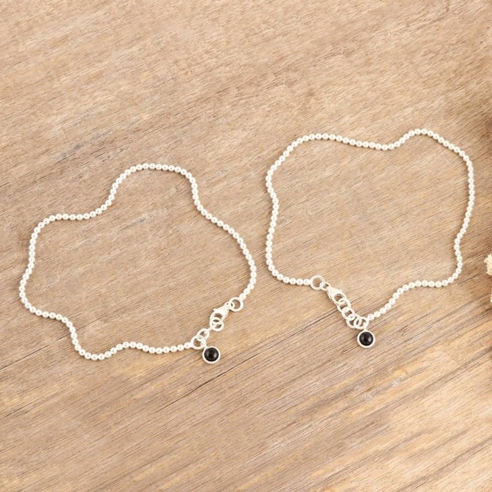 Pair of Sterling Silver Onyx Anklets from India 'Courage Orbs' Item ID: 2671786533