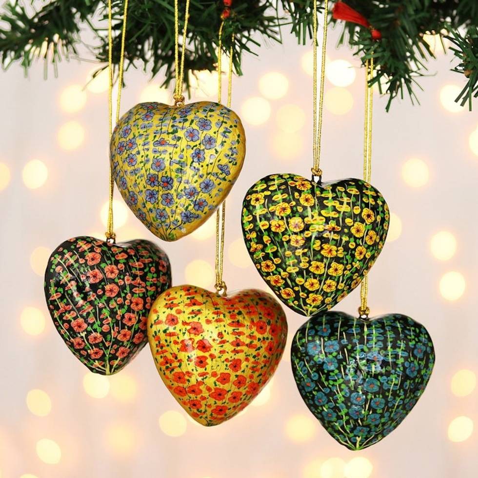 Papier Mache Heart Shaped Floral Ornaments Set of 5 'Christmas Garlands' Item ID: 2671789259