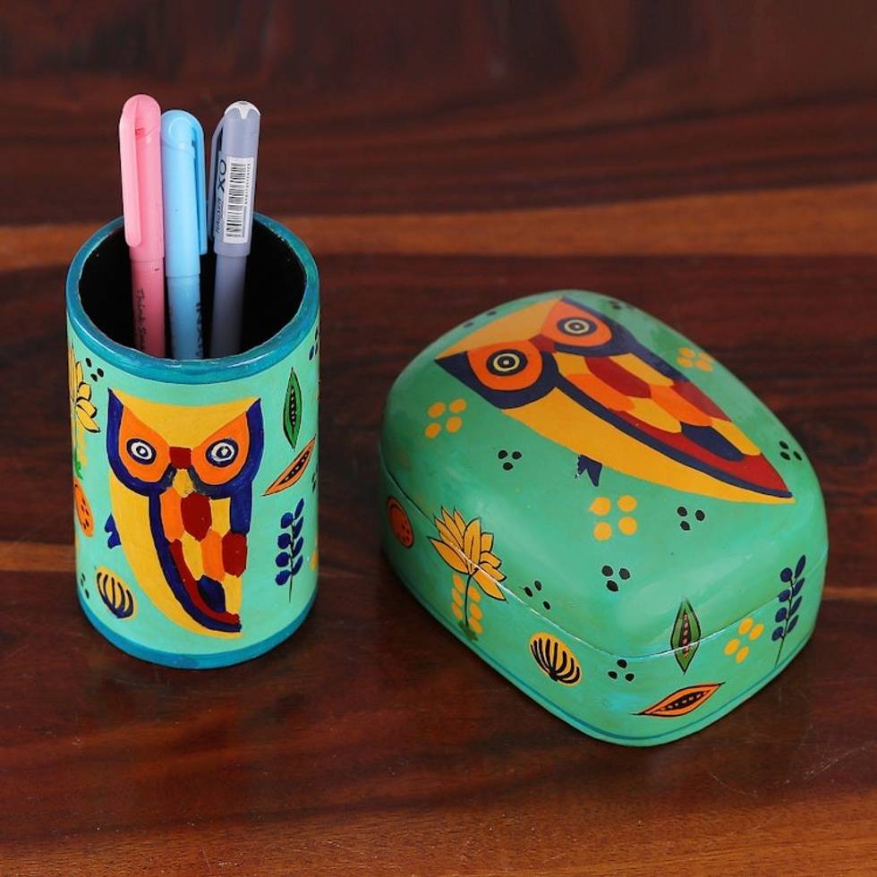 Papier Mache Owl-Motif Pen Holder 'Owl Story in Teal' Item ID: 2671788208