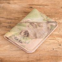 "Wendy Oviedo from Costa Rica designs and crafts this lovely passport holder whose leather exterior is printed with a playful sloth motif in subtle shades of beige, olive and brown. Inside, multiple compartments for your travel documents provide all the organization you need for your next trip."