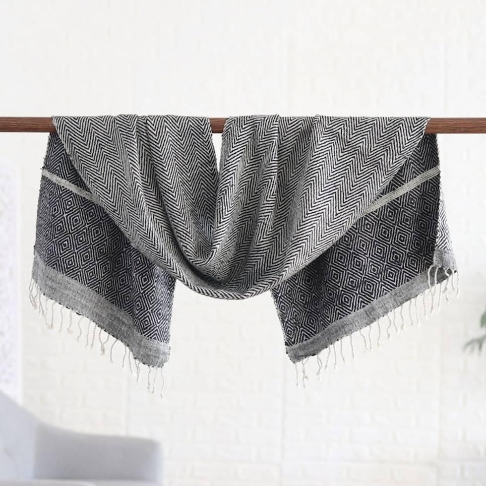 Patterned Black White 100 Silk Scarf Hand-woven in India 'Magic' Item ID: 2669956005
