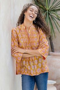 Patterned Honey and Salamander Cotton and Silk Blend Tunic 'Honey Saga' Item ID: 2669925621