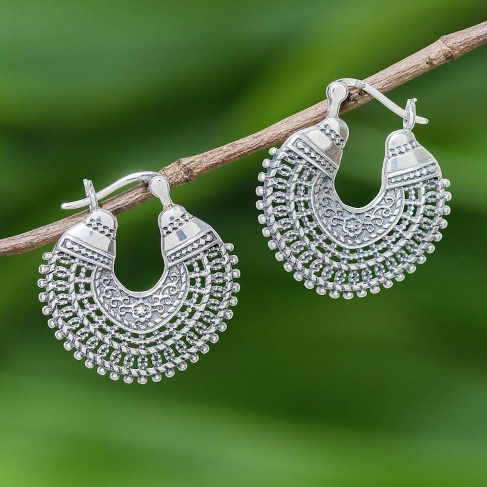 Patterned Sterling Silver Hoop Earrings from Thailand 'Thai Classic' Item ID: 2671798296