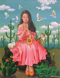 The artist explains that the cat and white rabbit symbolize rebirth and new beginnings, respectively, as they accompany the girl in her quest for peace. Circling above, white doves soar freely, symbolizing the release of a new period of peace under a pure blue sky. Thriving around the young woman, cacti, prickly pears and aloe represent the protection provided by mother nature, even in times of friction. An encouraging reminder of human resilience, the painting calls for a new peaceful era on planet Earth.