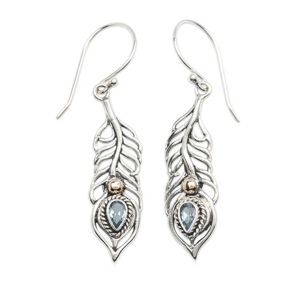 Peacock Feather Gold-Accented Blue Topaz Silver Earrings 'Radiant Feathers of the Wise' Item ID: 2676660964