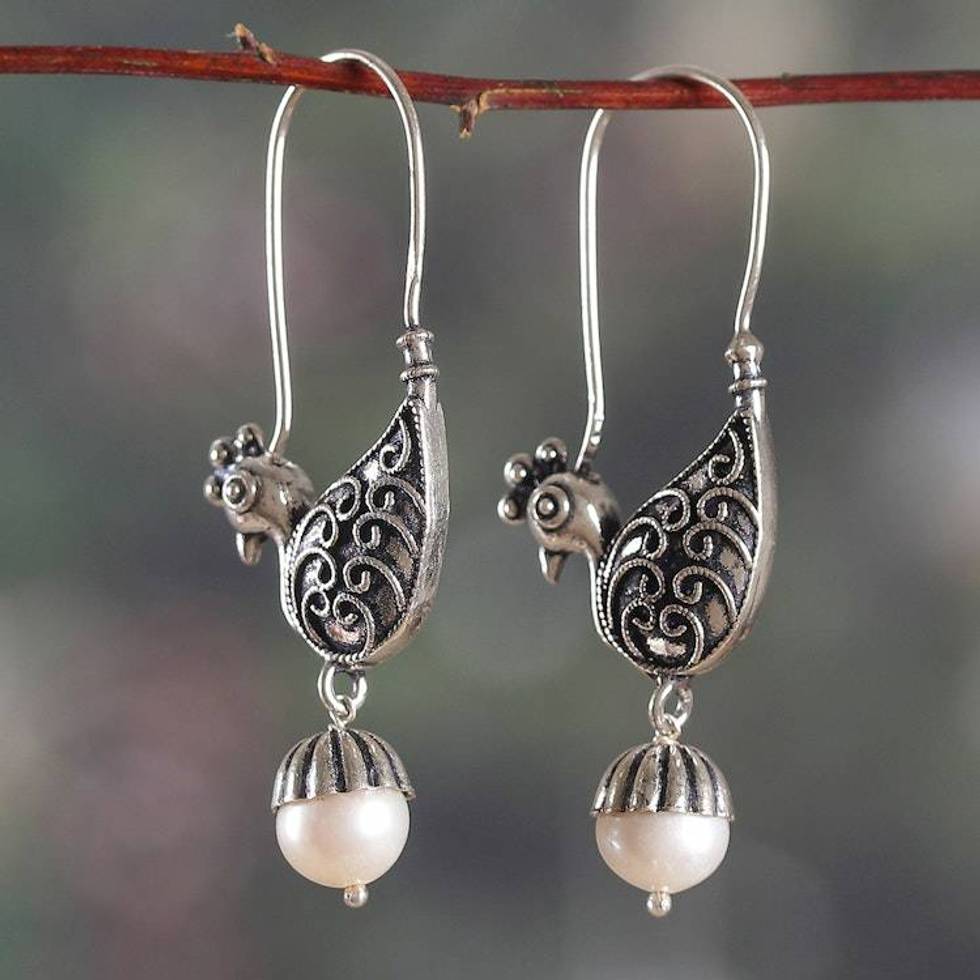 Peacock-Shaped Cultured Pearl and Silver Dangle Earrings 'White Peacock Whispers' Item ID: 2676664511