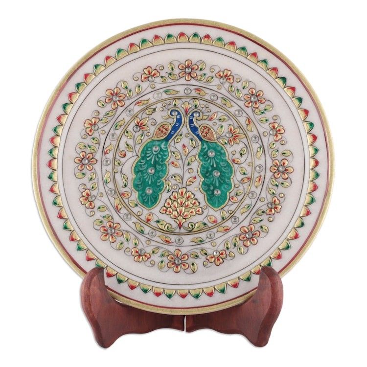 "Reigning an ethereal world with beauty and magnificence, the peacocks that decorate Anil Bhardwaj's newest creation are a symbol of divine power. Inspired by India's traditions, the artisan creates this marble decorative plate, masterfully adorned with peacock motifs, flowers and acrylic beads for a radiant look. The piece also includes a mango wood stand."