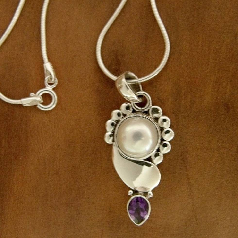 Pearl and Amethyst Pendant on Sterling Silver Necklace 'Rajasthan Glory' Item ID: 2671794849