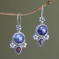 Pearl and Garnet Silver Dangle Earrings 'Frangipani Trio' Item ID: 2671821077